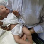 看護師の役割や実際の患者さん対応などで必要となる、包帯のほどけにくい巻き方など学びました。ミニ体験では赤ちゃん人形を用いて助産師の仕事なども学びました。